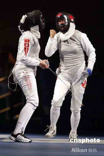 8月11日,北京奧運會女子花劍個人1/32決賽在北京國家會議中心擊劍館舉行,代表加拿大出戰(zhàn)的“擊劍媽媽”欒菊杰(右)以13:9的成績戰(zhàn)勝突尼斯選手伊娜·布貝克里,成功晉級。 中新社發(fā) 盛佳鵬 攝
