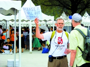 是我第六次到國外看奧運會,如果沒有看成比賽就太遺憾了!倍鴣碜月迳即壍腜aul則舉著自己一張射箭的票和一張舉重的票想要換一張體操比賽的票!拔蚁矚g看奧運會,但是你知道北京奧運會的票真難買啊,所以我就先買了一些別的,準備換我喜歡的項目門票來看!10分鐘過去了,Paul還是一無所獲,因為體操也是非常熱門的賽事。最終,Paul將這兩張門票原價轉(zhuǎn)讓給了一位女士,“能讓中國姑娘去看她喜歡的比賽我也挺高興的,我打算明天再來碰碰運氣!盤aul笑著告訴記者。