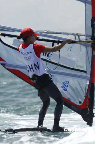 8月11日下午,奧帆賽尼爾級(jí)帆板開(kāi)賽,在剛剛結(jié)束的帆船女子帆板第02輪中,中國(guó)選手殷劍獲得第一名。 中新社發(fā) 周青先 攝