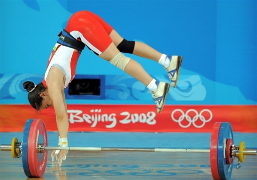 8月11日,阿爾巴尼亞選手羅梅拉·貝加伊試舉成功后興奮地翻起筋斗。當(dāng)日,北京奧運(yùn)會(huì)舉重女子58公斤級決賽在北京航空航天大學(xué)體育館舉行。