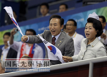 國際先驅導報特約撰稿張俊 實習記者聶東白發(fā)自北京 手持韓國國旗,隨拉拉隊的節(jié)奏不停揮舞。觀看完奧運開幕式的第二天,韓國總統李明博攜夫人悄然出現在北京奧體中心手球賽場,并安靜地走到主席臺最左邊座位坐下。韓國女子手球因為有總統助陣,最終以29平追平強悍的俄羅斯隊。