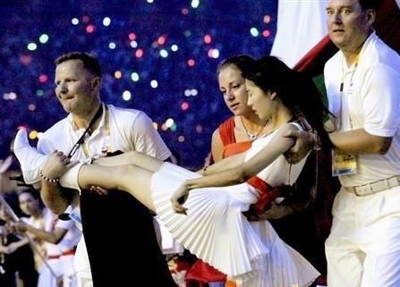忍高溫開幕式歡跳2小時(shí)暈倒白衣MM。