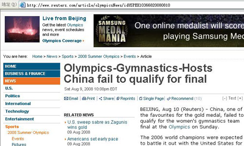 正當(dāng)中國觀眾慶賀中國體操女隊史無前例地以第一名的成績挺進團體決賽的時候,地球另一邊的英國路透社卻依然沉浸在自己的黃粱美夢中。他們在比賽結(jié)束后居然發(fā)出新聞,稱中國女隊已經(jīng)無緣決賽。