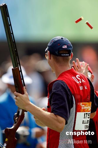 8月12日,北京奧運會男子飛碟雙多向決賽在北京射擊館進(jìn)行,美國選手格倫·埃勒以190中獲得金牌。 中新社發(fā) 盛佳鵬 攝