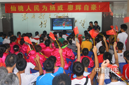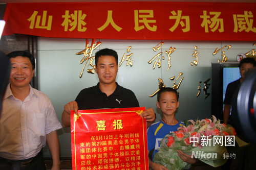 8月12日,楊威率領(lǐng)中國體操男隊奪得奧運(yùn)會團(tuán)體金牌。當(dāng)日中午時分,當(dāng)消息傳到楊威家鄉(xiāng)中國體操之鄉(xiāng)湖北仙桃市,早早守侯在電視機(jī)前的當(dāng)?shù)毓賳T、民眾一片沸騰,人們敲鑼打鼓、齊鳴鞭炮,熱烈慶賀仙桃籍運(yùn)動員楊威再次獲得奧運(yùn)會體操男團(tuán)冠軍。