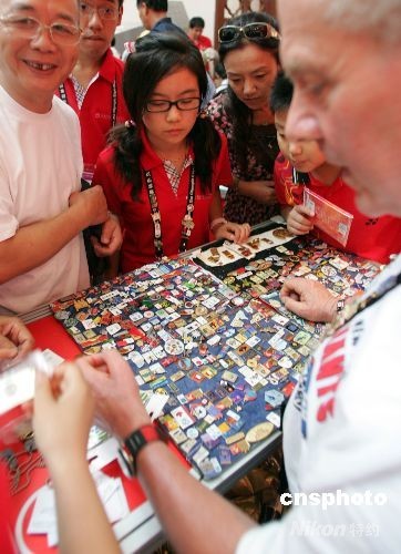 8月12日,眾多“國際級(jí)”紀(jì)念章收藏者在北京奧林匹克博覽會(huì)上擺攤兒,與前來歡享北京奧運(yùn)會(huì)的世界各地體育迷交換體育紀(jì)念章。象征著友誼的紀(jì)念章在奧林匹克的節(jié)日里——只換,不賣。中新社發(fā) 楊可佳 攝