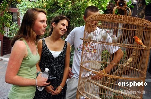 8月12日,首批美國學(xué)生來京觀看奧運(yùn)會(huì)并入住“奧運(yùn)人家”。他們是將要上大學(xué)的美國學(xué)生,克瑞斯表示很喜歡老北京的四合院,將在這里住3天。據(jù)悉,北京在奧運(yùn)會(huì)期間共開設(shè)598戶“奧運(yùn)人家”,可提供726間客房,能一次接待1000多名中外觀眾和游客。圖為他們很高興的欣賞四合院中的小鳥。中新社發(fā) 張雙雙 攝