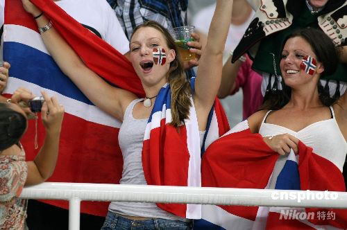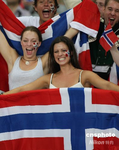 8月12日,兩位挪威美女專(zhuān)程趕來(lái)上海觀看奧運(yùn)賽事,為挪威女足加油助威。當(dāng)日,北京奧運(yùn)會(huì)女足小組賽,挪威VS日本的比賽在上海體育場(chǎng)進(jìn)行。 中新社發(fā) 湯彥俊 攝