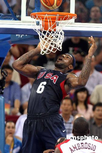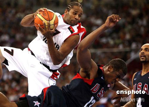 北京奧運會男子籃球小組賽第二輪賽事8月12日開始,美國“夢八隊”以97比76擊敗非洲冠軍安哥拉隊,取得小組賽兩連勝。非洲冠軍安哥拉隊雖然告負,但是其頑強的斗志與球技博得廣泛好評。中新社發(fā) 任晨鳴 攝