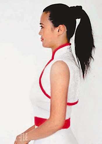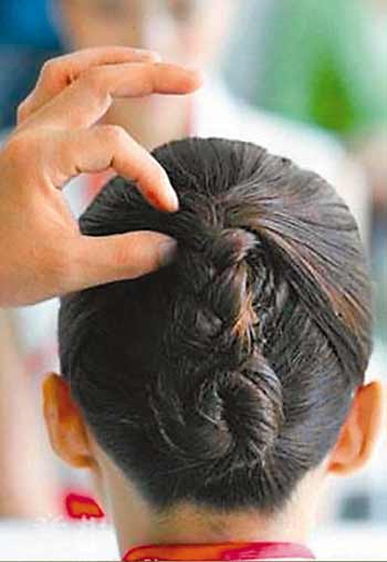 這款發(fā)型較為雅致,頭發(fā)向上向后自然盤成一個單包,以如意扣連接,下部盤以玫瑰纂,完美地結(jié)合了動感奔放與雅致含蓄,其中如意扣是最不突出設(shè)計因素的設(shè)計圖案,而玫瑰纂相對立體的感覺則充分考慮了側(cè)面的攝像效果。