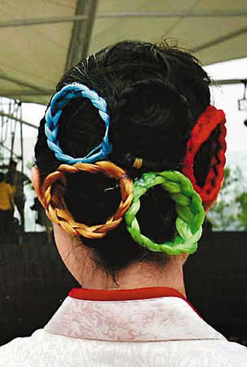 這款比較突出大的包發(fā),突出飽滿的熱情。此外,發(fā)型的線條動感十足,和旗袍的風(fēng)格也比較一致。另外,發(fā)型師特別搭配了奧運五環(huán)的小配飾,使發(fā)型脫離了單調(diào)的感覺,又體現(xiàn)了奧運元素。這個小飾品別在頭的側(cè)面,頒獎時觀眾很容易看到。