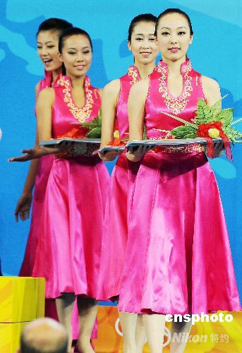 8月12日,北京奧運頒獎典禮由訓練有素的禮儀小姐負責引導選手及傳遞獎牌的工作,充分展現(xiàn)東方淑女的美麗風采。 中新社發(fā) CNAsports 攝