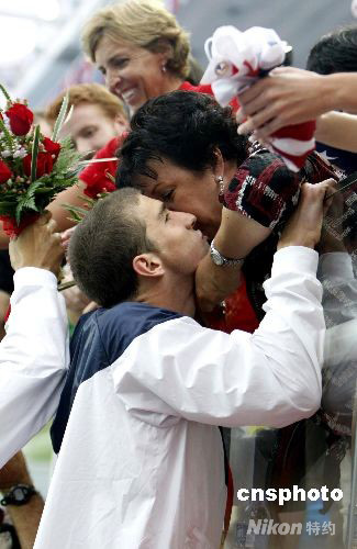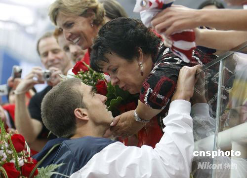8月13日,美國游泳傳奇人物菲爾普斯,在北京奧運(yùn)會男子4乘200米自由泳接力中奪得自己奧運(yùn)會的第11枚金牌后,擁抱并親吻在“水立方”看臺上觀戰(zhàn)的媽媽黛比(Debbie)。 中新社發(fā) 杜洋 攝