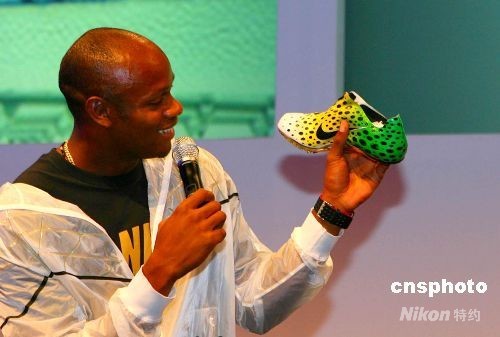 8月12日夜,世界短跑名將鮑威爾在北京發(fā)布強(qiáng)力短跑釘鞋,鮑威爾本人參與該跑鞋的設(shè)計(jì)過程。圖為他在展示該跑鞋。中新社發(fā) 沈晨 攝