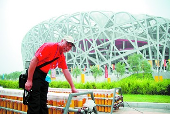 鐘自奇在鳥(niǎo)巢附近檢查焰火產(chǎn)品。鐘勇攝