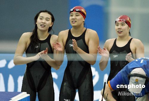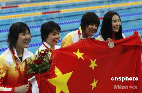 8月14日11時,北京奧運會女子4x200米自由泳接力決賽在國家游泳中心水立方舉行,由朱穎文、徐妍瑋、楊雨、龐佳穎組成的中國隊,以7分45秒93的成績戰(zhàn)勝美國隊,為中國泳團(tuán)再添一枚銀牌。澳大利亞女隊以7分44秒31打破世界紀(jì)錄獲得金牌。美國隊獲得第三,成績是7分46秒33。 中新社發(fā) 杜洋 攝