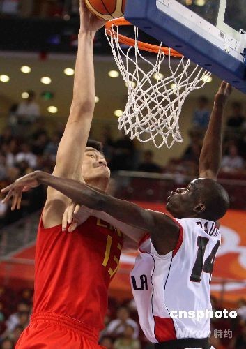 8月14日下午,北京奧運會男子籃球小組第四輪賽事在北京五棵松籃球館舉行,同為兩戰(zhàn)兩負的中國隊與安哥拉隊展開“生死大戰(zhàn)”。身高2.26米的中國隊超級中鋒姚明開場扣籃得分。中新社發(fā) 任晨鳴 攝