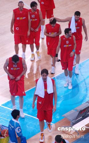 2008年8月14日上午,加索爾領(lǐng)銜的世錦賽和歐錦賽冠軍西班牙隊(duì)在奧運(yùn)會籃球小組賽中,以72比59戰(zhàn)勝諾維斯基領(lǐng)銜的德國戰(zhàn)車。 中新社發(fā) Eddie Zhang 攝
