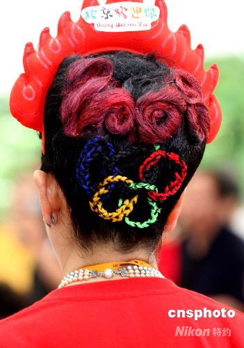 8月14日,青島奧運帆船賽場,熱情觀眾在展示頭帶五環(huán)的發(fā)髻。中新社發(fā) 趙振清 攝