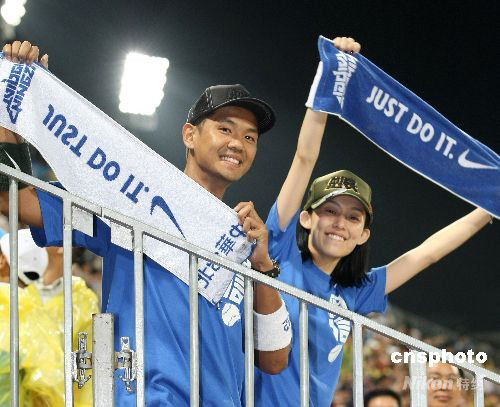 8月14日晚,在北京五棵松棒球場進行的中華臺北對日本之戰(zhàn)吸引了眾多臺灣球迷的目光。臺灣當紅藝人陳建州(左)和范瑋琪(右)專程到場為中華臺北隊加油。 中新社發(fā) CNAsports 攝