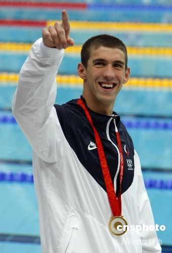 8月15日上午,在國家游泳中心水立方舉行的北京奧運會男子200米混合泳中,美國選手菲爾普斯續(xù)寫神話,再次打破世界紀錄獲得冠軍,收取他在本屆奧運的第六枚金牌,使得他在奧運會上獲得的金牌總數(shù)達到12枚。中新社發(fā) 杜洋 攝