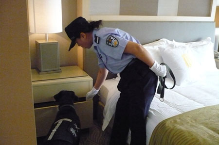 帶犬民警在上海市涉奧賓館進(jìn)行安檢