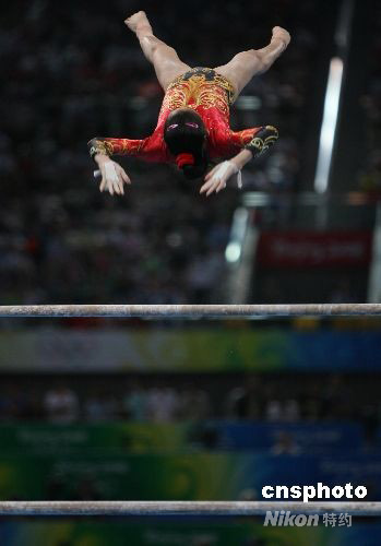 圖為中國(guó)選手江鈺源在高低杠比賽中。