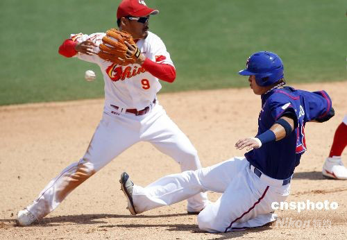 圖為中華臺北隊(duì)28號隊(duì)員羅國輝(右)在比賽中。