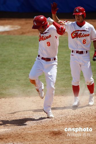 8月15日,北京奧運(yùn)會(huì)棒球男子預(yù)賽在北京五棵松棒球場(chǎng)舉行,中國(guó)隊(duì)對(duì)陣中華臺(tái)北隊(duì)。最終中國(guó)隊(duì)經(jīng)過四個(gè)多小時(shí)的苦戰(zhàn),以8:7逆轉(zhuǎn)戰(zhàn)勝中華臺(tái)北隊(duì)。圖為中國(guó)隊(duì)9號(hào)張玉峰(左)慶祝得分。中新社發(fā) 盛佳鵬 攝