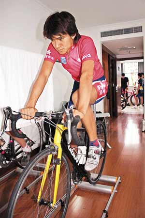 按計劃,“阿寶”與黃蘊瑤今天本應(yīng)進(jìn)行公路訓(xùn)練,但因天雨以及單車館內(nèi)有其它車隊正在訓(xùn)練的關(guān)系,唯有在室內(nèi)器械上進(jìn)行練習(xí)。其中“阿寶”邊練邊反復(fù)觀看錄像帶。“他正在看去年‘好運北京’測試賽的錄像,16日的比賽,我們打算以測試賽的戰(zhàn)術(shù)為藍(lán)本,他反復(fù)地看,已不知看多少次了!鄙蚪叹毥忉尩。