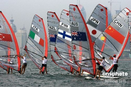 8月15日,青島奧帆中心,大型帆船托納多級和星級首次進入比賽,中國選手首次露面。男女帆板各國選手繼續(xù)激烈競爭,中國女子帆板殷劍努力拼爭,試圖保持自己的總排名第一位置,奪金有望。中新社發(fā) 肖冰 攝