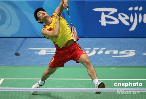 8月15日,中國選手林丹在北京奧運會羽毛球男子單打半決賽中以2比0戰(zhàn)勝隊友陳金,進入決賽。中新社發(fā) 武仲林 攝