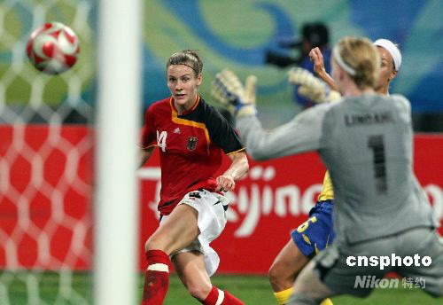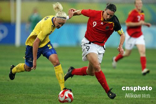 8月15日,北京奧運(yùn)會(huì)沈陽(yáng)足球分賽場(chǎng)舉行女足1/4決賽,德國(guó)隊(duì)?wèi){借加時(shí)賽,以2:0戰(zhàn)勝瑞典隊(duì),進(jìn)入半決賽。中新社發(fā) 張宇 攝