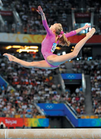 昨天中午,國家體育館中,女子體操全能決賽的最后一個項目是自由體操,美國選手柳金倒數(shù)第二個出場,這位19歲女孩有著高挑的身材和柔美的氣質(zhì)。隨著一曲充滿俄羅斯風情的《黑眼睛》,身著粉衣的柳金開始了技驚四座的表演,只見她以一串又高又飄的跟頭精彩亮相,而后柳金憑借優(yōu)雅舒展的舞蹈和流暢而富有張力的動作贏得了觀眾雷鳴般的掌聲,最后當她以輕輕的踢腿動作在場地上定格時,全場沸騰了。盡管最后一名隊員肖恩還沒有上場,但如此精彩的演出足以讓她得到金牌。
