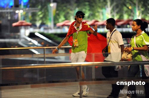 8月16日凌晨,外國觀眾身披中國國旗游覽奧林匹克公園。中新社發(fā) 廖攀 攝