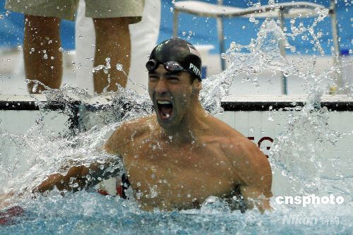 8月16日上午,菲爾普斯在北京奧運(yùn)男子100米蛙泳項(xiàng)目中以50秒58秒的成績奪得他在本屆奧運(yùn)會(huì)上的第七塊金牌。獲得銀牌的捷克選手只比菲爾普斯慢了0.01秒。 此前菲爾普斯已經(jīng)得到了男子400米個(gè)人混合泳、男子4×100米自由泳接力、男子200米自由泳、男子200米蝶泳、男子4×200米自由泳接力和男子200米個(gè)人混合泳六塊金牌。 中新社發(fā) 杜洋 攝