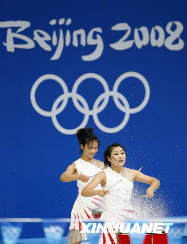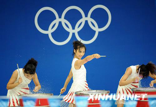 8月16日,演員們?cè)谟斡颈荣愰_始前進(jìn)行水鼓表演。