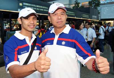 中華臺(tái)北奧運(yùn)跆拳道代表隊(duì)選手宋玉麒(左)出發(fā)時(shí)候在桃園機(jī)場(chǎng)表示,身為本次中華臺(tái)北代表隊(duì)教練的父親宋景宏,是他參賽的最大附身符。圖為父子倆出征奧運(yùn)時(shí)候在機(jī)場(chǎng)向送行者亮出大拇指。(上圖)