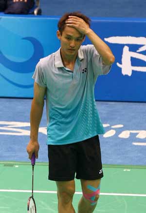 2008北京奧運(yùn)會羽毛球項目14繼續(xù)日在北京工業(yè)大學(xué)體育館進(jìn)行男子單打比賽,中華臺北隊選手謝裕興以2比0輸給陳金,止于八強(qiáng)。圖為謝裕興在被淘汰后再思考 (下圖)