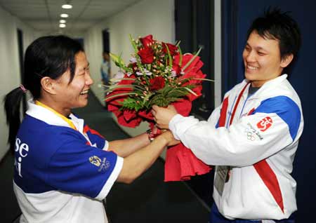 中華臺(tái)北代表隊(duì)舉重女將盧映锜(右)12日在女子63公斤級(jí),以抓舉104公斤、挺舉127公斤,總合231公斤的成績(jī)贏得銅牌,另一面銅牌得主隊(duì)友陳葦綾(左)獻(xiàn)上鮮花祝賀。(上圖)
