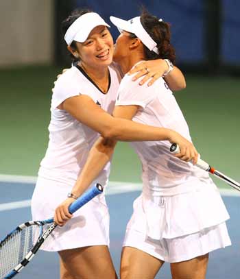 12日晚間進(jìn)行女子網(wǎng)球雙打第一輪比賽,中華臺(tái)北隊(duì)詹詠然(左)、莊佳容(右)打到第三盤(pán)擊敗法國(guó)隊(duì)順利晉級(jí),兩人高興的抱在一起。(上圖)