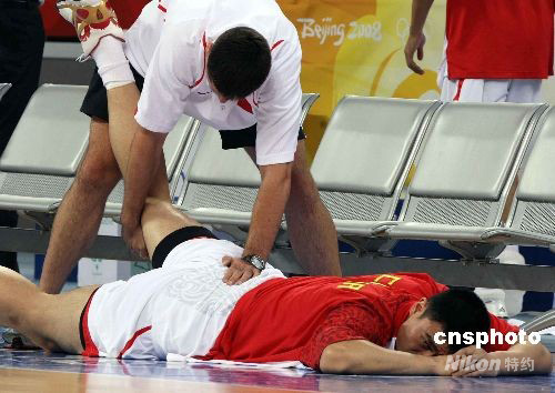 8月16日,北京奧運(yùn)會(huì)男子籃球小組賽第四輪比賽在五棵松籃球館舉行,為了爭(zhēng)奪小組出線(xiàn)權(quán)而躋身八強(qiáng)之列,由姚明率領(lǐng)的中國(guó)隊(duì)與由諾維斯基、卡曼率領(lǐng)的德國(guó)隊(duì)展開(kāi)“生死大戰(zhàn)”之前兩小時(shí),中國(guó)隊(duì)就到達(dá)賽場(chǎng),姚明在場(chǎng)地內(nèi)一邊“偷窺”德國(guó)隊(duì)的訓(xùn)練,一邊接受火箭隊(duì)隊(duì)醫(yī)的專(zhuān)門(mén)治療。中新社發(fā) 任晨鳴 攝
