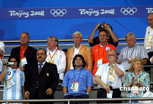 8月16日,北京奧運(yùn)會(huì)男足,阿根廷VS荷蘭的比賽在上海體育場進(jìn)行。球王馬拉多納親臨上海為阿根廷加油助威。中新社發(fā) 湯彥俊 攝