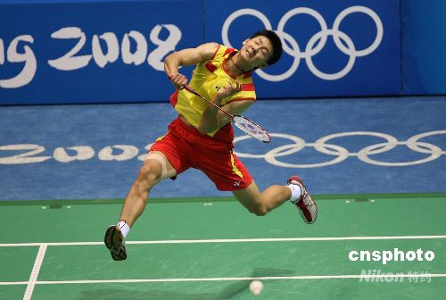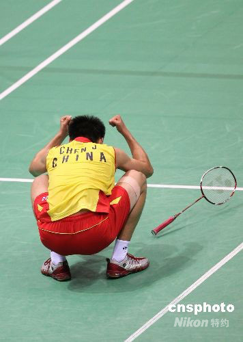 8月16日晚,中國(guó)選手陳金在北京奧運(yùn)會(huì)羽毛球男子單打銅牌爭(zhēng)奪戰(zhàn)中以2比1戰(zhàn)勝韓國(guó)選手李炫一,奪得銅牌。中新社發(fā) 武仲林 攝