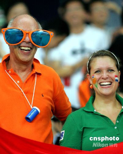 8月16日,北京奧運(yùn)會(huì)男足阿根廷對陣荷蘭的比賽在上海體育場進(jìn)行。一位荷蘭球迷帶著一副巨型眼鏡在比賽現(xiàn)場觀看比賽,吸引了不少好奇的目光。中新社發(fā) 湯彥俊 攝
