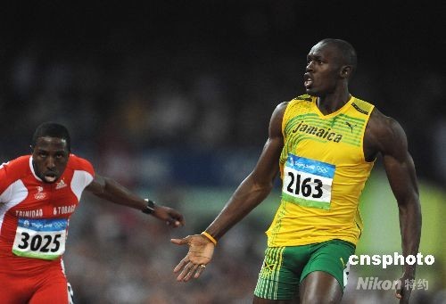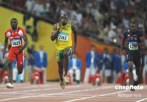 8月16日晚,牙買加選手尤塞恩·博爾特在中國國家體育場“鳥巢”進(jìn)行的北京2008年第二十九屆奧運(yùn)會男子100米決賽中,以9秒69的成績奪得金牌并打破9秒72的世界紀(jì)錄。中新社發(fā) 古玉 攝
