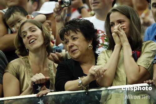 圖為菲爾普斯的媽媽黛比(中)和姐姐在看臺(tái)上為菲爾普斯加油助威。