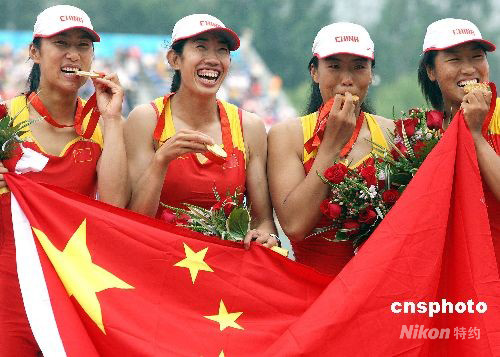 8月17日下午,中國組合唐賓、金紫薇、奚愛華、張楊楊在北京奧運會賽艇女子四人雙槳決賽中以6分15秒95的成績超越英國、德國等世界名將獲得冠軍。中新社發(fā) 任晨鳴 攝