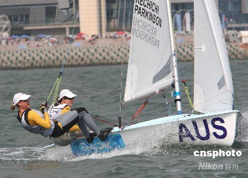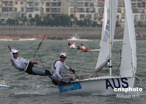 8月18日,北京2008奧運帆船比賽在青島分賽場舉行,澳大利亞隊內森·威爾莫特、馬爾科姆·佩奇組合和埃莉斯·雷基基、特莎·帕金森組合分獲男子雙人艇四七0級和女子雙人艇四七0級冠軍。中新社發(fā) 趙振清 攝