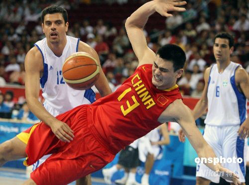 北京奧運(yùn)會(huì)男子籃球小組賽第五輪比賽8月18日在五棵松籃球館舉行,由姚明統(tǒng)率的中國(guó)隊(duì)與世界勁旅希臘隊(duì)為八強(qiáng)位置展開激戰(zhàn),最終,實(shí)力不足的中國(guó)隊(duì)以77比91告負(fù);雖然姚明砍下全隊(duì)最高的16分,但對(duì)全局無(wú)濟(jì)于事。 中新社發(fā) 任晨鳴 攝